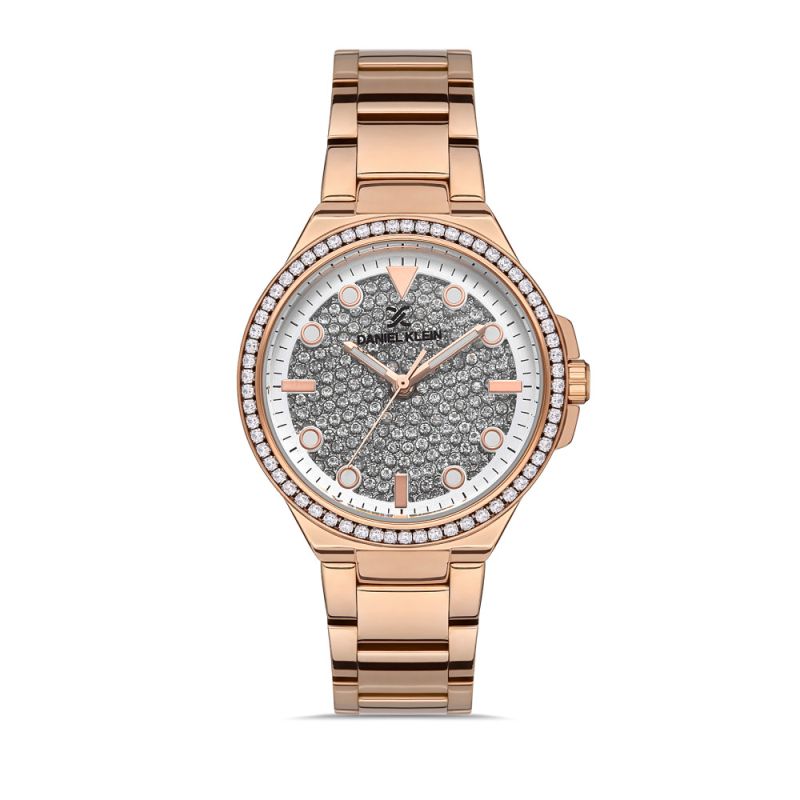 Дамски часовник Daniel Klein от колекция Premium. Моделът е с аналогов дисплей с интересна визия и декорация от инкрустирани кристали по безела. Луминисцентно покритие на стрелките и индексите. Стъклото е минерал-кристал. Корпусът е от метал, съчетан с верижка от неръждаема стомана. Задвижва се от кварцов механизъм. Водоустойчивост 3 ATM - допускат се леки пръски, не се препоръчва обилно мокрене.