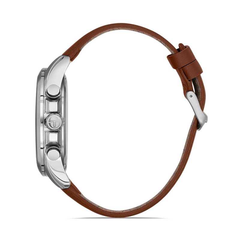 Спортно-елегантен мъжки часовник Sergio Tacchini от колекцията Archivio. Моделът е с корпус от неръждаема стомана и каишка от естествена кожа. Сив мултифункционален дисплей с оранжеви детайли. Стъкло минерал-кристал. Кварцов механизъм. Водоустойчивост 5 ATM - допускат се леки пръски и взимане на душ, не се препоръчва обилно мокрене.