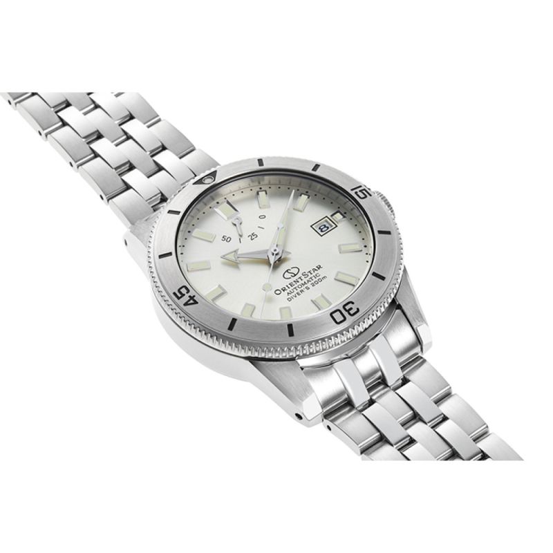 Мъжки часовник Orient Star с модерен спортнен дизайн. Моделът е с корпус и верижка от неръждаема стомана. Сребрист аналогов дисплей с показател за дата и индикатор за резервната мощност. Фосфорисциращи стрелки и индекси. Сапфирено стъкло с антрирефлексно покритие. Задвижва се от автоматичен механизъм F6N47 с резервна мощност 50 часа. Водоустойчивост 20 ATM - позволява мокрене, къпане, плуване и гмуркане във водни басейни.