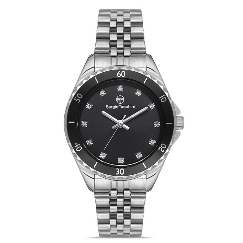 Дамски часовник Sergio Tacchini с нежна и модерна визия от колекцията Archivio. Моделът е с корпус и верижка от неръждаема стомана. Черен циферблат с декорация от инкрустирани кристали на часовите маркери. Кварцов механизъм. Водоустойчивост 5 ATM - допускат се леки пръски и взимане на душ, не се препоръчва обилно мокрене.