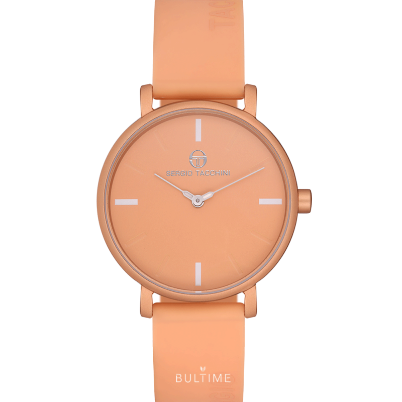 Дамски часовник Sergio Tacchini от колекцията Streamline. Моделът е с корпус от алуминий, съчетан със силиконова каишка. Аналогов дисплей с изчистен дизайн в оранжев цвят. Минерално стъкло, устойчиво на надраскване. Задвижва се от кварцов механизъм. Водоустойчивост 5 ATM - допускат се леки пръски и взимане на душ, не се препоръчва обилно мокрене.
