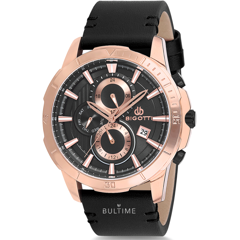 Елегантен мъжки часовник Bigotti с мултифункционален дисплей. Минерално стъкло, устойчиво на надраскване. Метален корпус в комбинация с черна каишка от естествена кожа. Задвижва се от кварцов механизъм. Водоустойчивост 5 ATM - допускат се леки пръски и взимане на душ, не се препоръчва обилно мокрене.