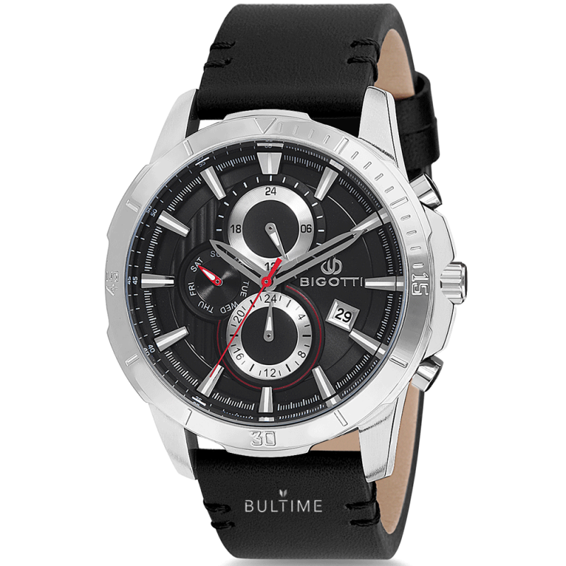 Елегантен мъжки часовник Bigotti с мултифункционален дисплей. Минерално стъкло, устойчиво на надраскване. Метален корпус в комбинация с черна каишка от естествена кожа. Задвижва се от кварцов механизъм. Водоустойчивост 5 ATM - допускат се