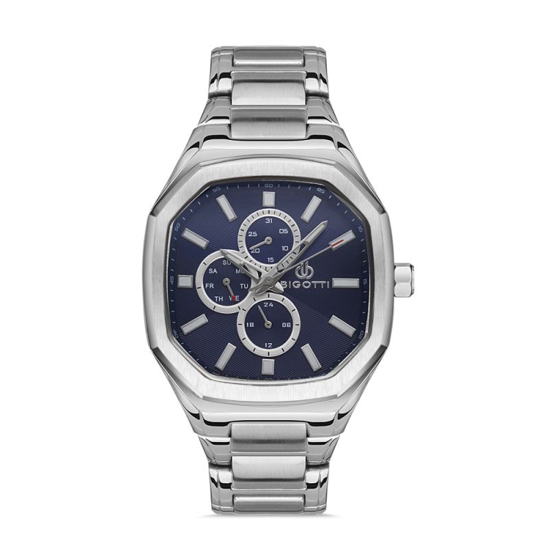 Мъжки часовник Bigotti с модерен спортно-елегантен дизайн от колекцията Milano. Син мултифункционален дисплей със сребристи детайли. Луминисцентно покритие на стрелките и индексите. Минерално стъкло, устойчиво на надраскване. Моделът е с метален корпус и верижка от неръждаема стомана. Задвижва се от кварцов механизъм. Водоустойчивост 5 ATM - допускат се леки пръски и взимане на душ, не се препоръчва обилно мокрене.