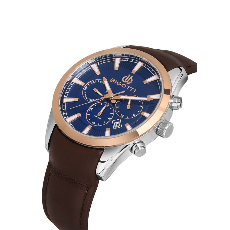 Спортно-елегантен мъжки часовник Bigotti от колекцията Milano. Моделът е с мултифункционален дисплей. Луминисцентно покритие на стрелките и индексите. Минерално стъкло, устойчиво на надраскване. Метален корпус съчетан с каишка от естествена кожа. Часовникът се задвижва от кварцов механизъм. Водоустойчивост 5 ATM - допускат се леки пръски и взимане на душ, не се препоръчва обилно мокрене.