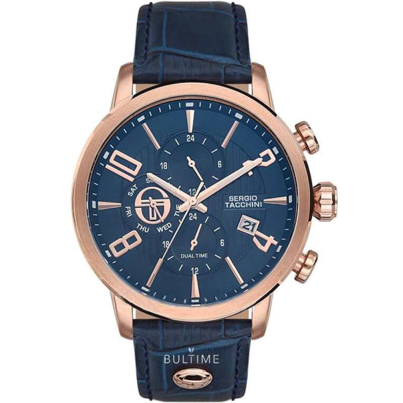 Спортно-елегантен мъжки часовник Sergio Tacchini от колекцията City Dual Time. Мултифункционален дисплей с фосфоресциращи стрелки и показатели за дата, ден и двойно време. Минерално стъкло, устойчиво на надраскване. Корпус от неръждаема стомана. Синя кожена каишка. Кварцов механизъм. Водоустойчивост 5 ATM - допускат се леки пръски и взимане на душ, не се препоръчва обилно мокрене.