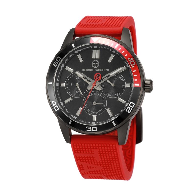 Спортен модел мъжки часовник Sergio Tacchini от колекцията Archivio. Корпус от неръждаема стомана. Черен мултифункционален дисплей, съчетан с червена силиконова каишка. Стъкло минерал-кристал. Задвижва се от кварцов механизъм. Водоустойчивост 5 ATM - допускат се леки пръски и взимане на душ, не се препоръчва обилно мокрене.