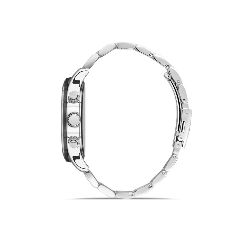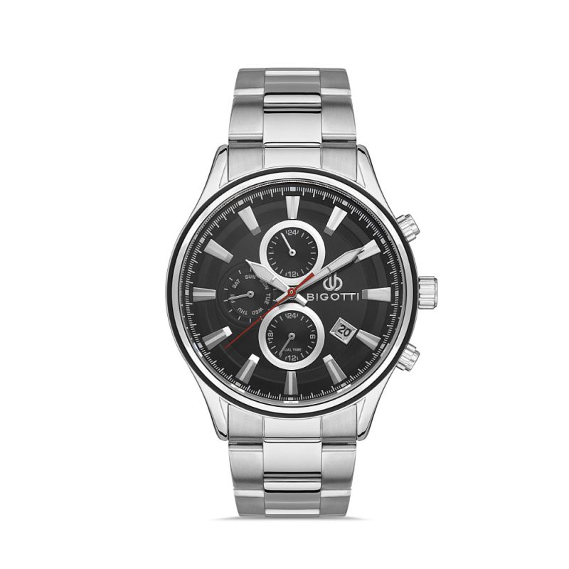 Мъжки часовник Bigotti с модерна елегантна визия от колекцията Milano. Черен мултифункционален дисплей със сребристи детайли. Луминисцентно покритие на стрелките и индексите. Минерално стъкло, устойчиво на надраскване. Метален корпус съчетан с верижка от неръждаема стомана. Задвижва се от кварцов механизъм. Водоустойчивост 5 ATM - допускат се леки пръски и взимане на душ, не се препоръчва обилно мокрене.
