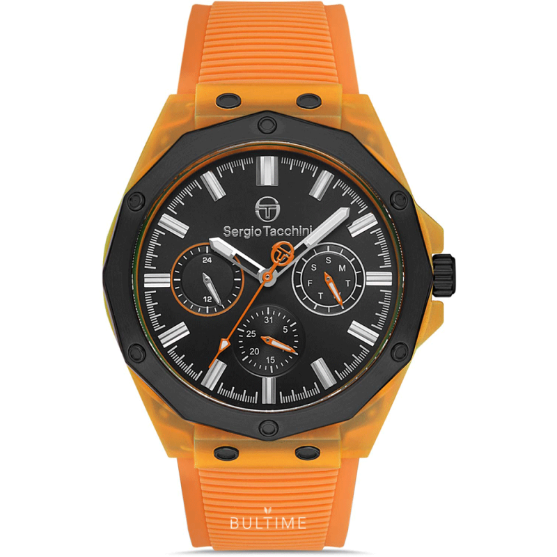 Мъжки часовник Sergio Tacchini със спортно-ежедневен дизайн от колекцията Streamline. Моделът е с черен мултифункционален дисплей и минерално стъкло. Корпус от полимер. Оранжева силиконова каишка. Кварцов механизъм. Водоустойчивост 5 ATM - допускат се леки пръски и взимане на душ, не се препоръчва обилно мокрене.