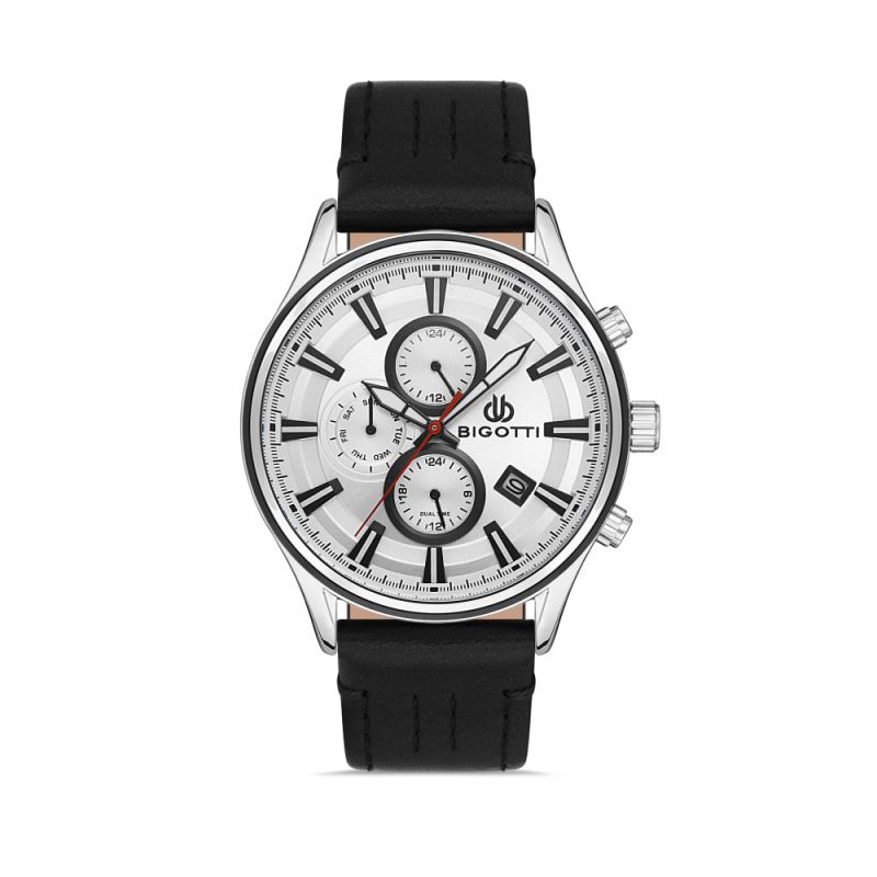 Спортно-елегантен мъжки часовник Bigotti с модерна визия от колекцията Milano. Моделът е с мултифункционален дисплей в сребрист цвят с черни детайли. Луминисцентно покритие на стрелките и индексите. Минерално стъкло, устойчиво на надраскване. Корпус изработен от метал. Черна каишка от естествена кожа. Задвижва се от кварцов механизъм. Водоустойчивост 5 ATM - допускат се леки пръски и взимане на душ, не се препоръчва обилно мокрене.