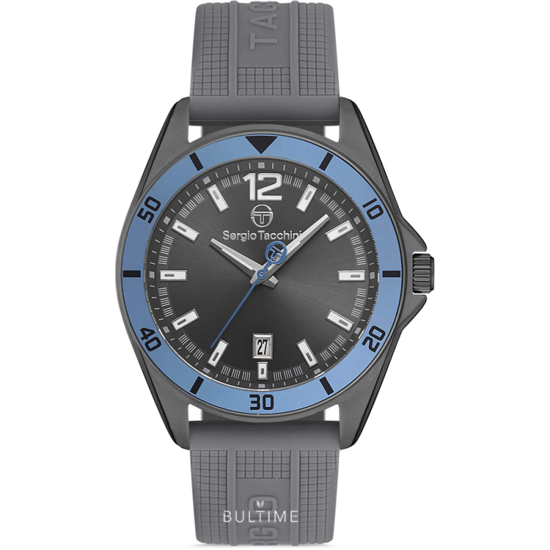 Мъжки часовник Sergio Tacchini със спортно-ежедневен дизайн от колекцията Streamline. Моделът е със сив аналогов дисплей с показател за дата и минерално стъкло. Корпус от неръждаема стомана. Сива силиконова каишка. Светлосин безел. Кварцов механизъм. Водоустойчивост 5 ATM - допускат се леки пръски и взимане на душ, не се препоръчва обилно мокрене.