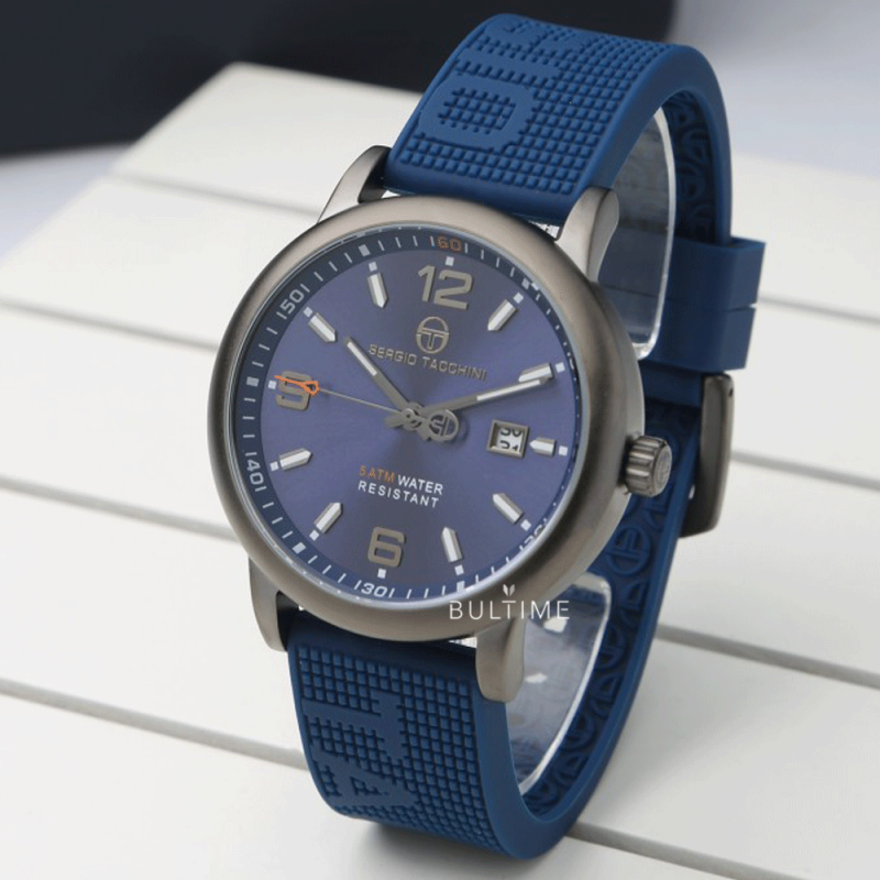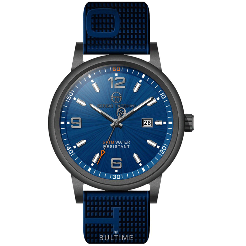Мъжки часовник Sergio Tacchini с модерна спортна визия от колекцията Streamline. Моделът е с аналогов дисплей и показател за дата. Стъкло минерал-кристал. Корпус изработен от месинг. Тъмносиня силиконова каишка. Кварцов механизъм. Водоустойчивост 5 ATM - допускат се леки пръски и взимане на душ, не се препоръчва обилно мокрене.