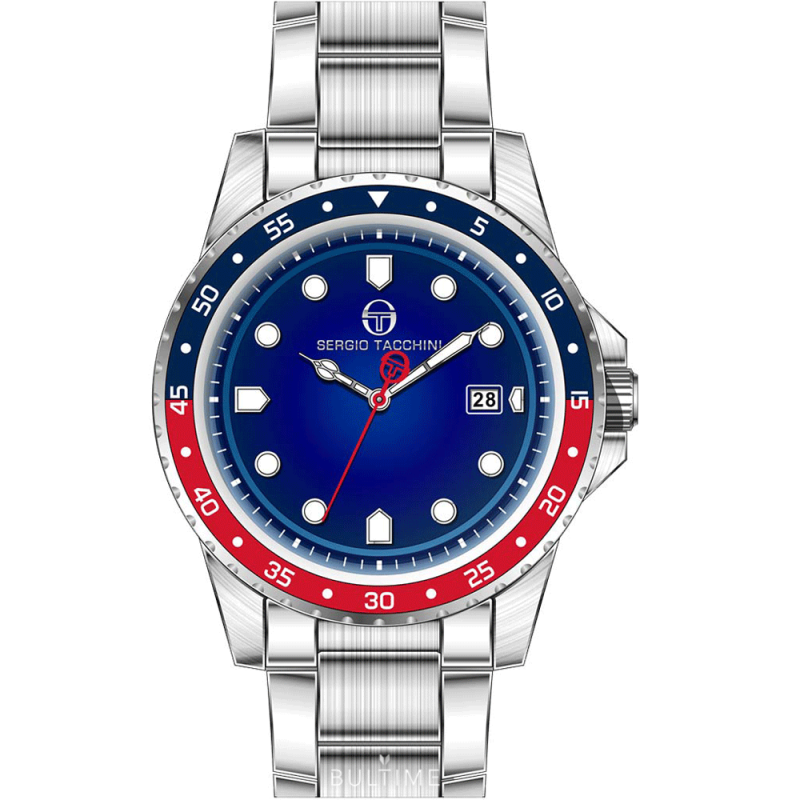 Мъжки часовник Sergio Tacchini от колекцията Archivio. Син аналогов дисплей с показател за дата. Стъкло минерал-кристал. Корпус и верижка от неръждаема стомана. Задвижва се от кварцов механизъм. Водоустойчивост 5 ATM - допускат се леки пръски и взимане на душ, не се препоръчва обилно мокрене.