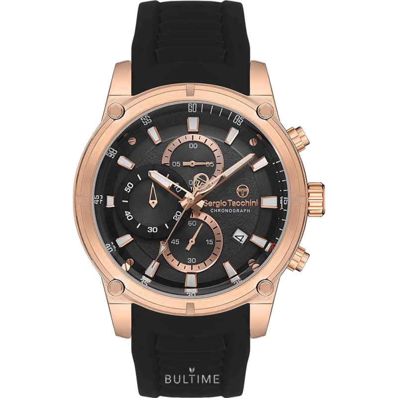 Спортен мъжки часовник Sergio Tacchini от колекцията Archivio. Моделът е с корпус от неръждаема стомана и силиконова каишка. Черен текстуриран дисплей тип хронограф. Стъкло минерал-кристал, устойчиво на надраскване. Задвижва се от кварцов механизъм. Водоустойчивост 5 ATM - допускат се леки пръски и взимане на душ, не се препоръчва обилно мокрене.