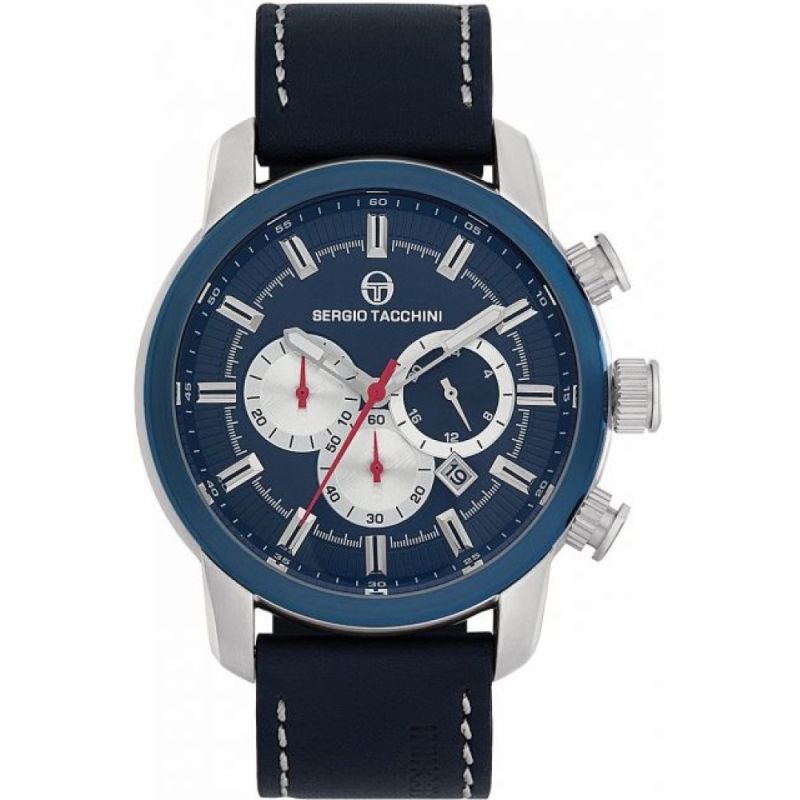 Спортно-елегантен мъжки часовник Sergio Tacchini от колекцията Archivio Chronograph. Моделът е с тъмносин дисплей хронограф с точност 1/60 от минутата и максимално измервано време 30 минути. Фосфоресциращи стрелки. Минерално стъкло, устойчиво на надраскване с антирефлексно покритие. Корпус от неръждаема стомана, съчетан с каишка от естествена кожа. Прецизен кварцов механизъм JS25 CITIZEN MIYOTA произведен в Япония. Водоустойчивост 10 ATM - позволява мокрене, къпане и плуване във водни басейни.
