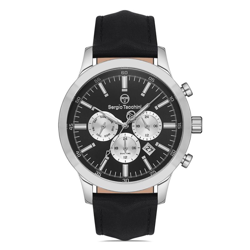 Мъжки часовник Sergio Tacchini от колекцията Archivio с каишка от естествена кожа и корпус от неръждаема стомана. Мултифункционален дисплей с минерално стъкло и показатели за дата, ден от седмицата и двойно време. Задвижва се от кварцов механизъм. Водоустойчивост 5 ATM - допускат се леки пръски и взимане на душ, не се препоръчва обилно мокрене.