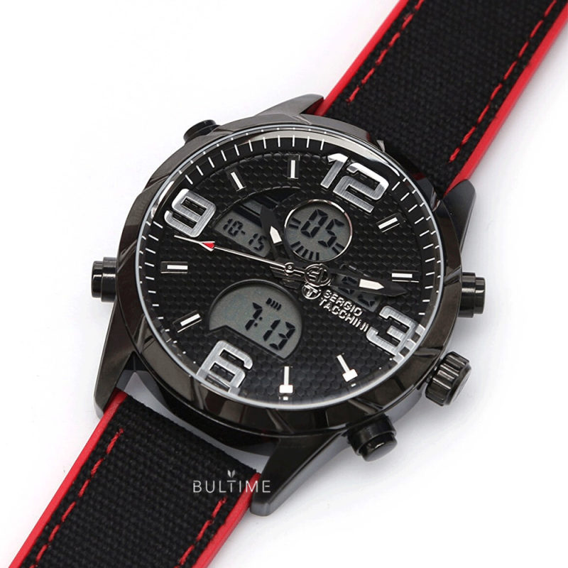 Спортно-елегантен мъжки часовник Sergio Tacchini от колекцията Archivio. Моделът е с черен дисплей с дигитални показатели и аналогови стрелки. Стъкло минерал-кристал. Корпус от метал, съчетан със силиконова каишка. Кварцов механизъм. Водоустойчивост 5 ATM - допускат се леки пръски и взимане на душ, не се препоръчва обилно мокрене.