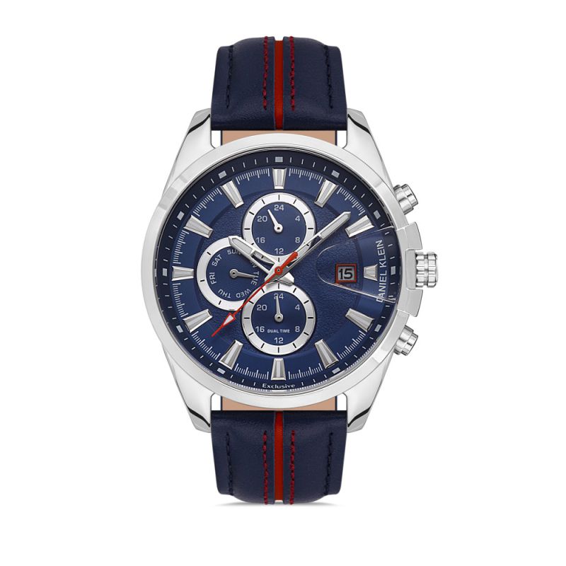 Спортно-елегантен мъжки часовник Daniel Klein с модерна визия от колекцията Exclusive. Моделът е с метален корпус съчетан с каишка от естесвена кожа. Мултифункционален дисплей с показатели за дата, ден от седмицата и двойно време. Луминисцентно покритие на стрелките и индексите. Минерално стъкло, устойчиво на надраскване. Часовникът се задвижва от кварцов механизъм. Водоустойчивост 5 ATM - допускат се леки пръски и взимане на душ, не се препоръчва обилно мокрене.