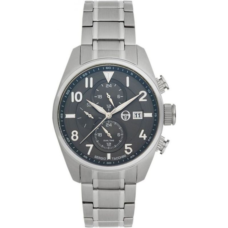 Мъжки часовник Sergio Tacchini от колекцията City Dual Time. Моделът е с корпус и верижка от неръждаема стомана. Мултифункционален дисплей с показатели за дата, ден и двойно време. Фосфоресциращи стрелки и индекси. Минерално стъкло, устойчиво на надраскване с антирефлексно покритие. Прецизен кварцов механизъм JP15 CITIZEN MIYOTA произведен в Япония. Водоустойчивост 10 ATM - позволява мокрене, къпане и плуване във водни басейни.