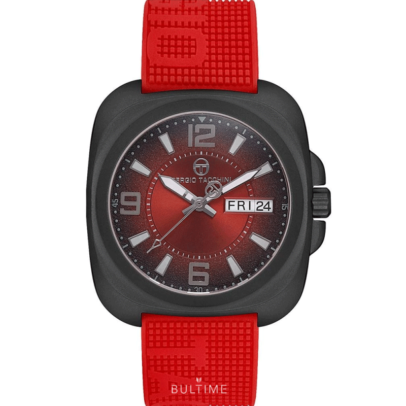 Мъжки часовник Sergio Tacchini с модерна спортно-елегантна визия от колекцията Streamline. Корпус изработен от месинг. Червена силиконова каишка. Аналогов дисплей с преливащи се цветове в черно и червено и показател за дата и ден. Стъкло минерал-кристал. Кварцов механизъм. Водоустойчивост 5 ATM - допускат се леки пръски и взимане на душ, не се препоръчва обилно мокрене.