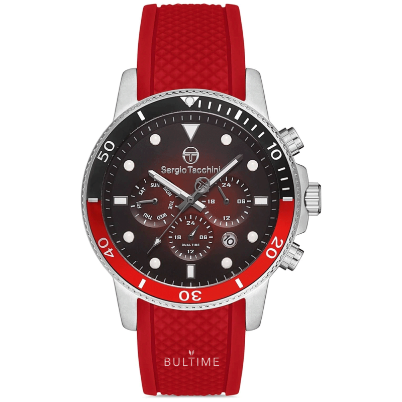 Спортен модел мъжки часовник Sergio Tacchini с мултифункционален дисплей от колекцията Archivio. Корпус от неръждаема стомана. Червена силиконова каишка. Минерално стъкло, устойчиво на надраскване. Задвижва се от кварцов механизъм. Водоустойчивост 5 ATM - допускат се леки пръски и взимане на душ, не се препоръчва обилно мокрене.