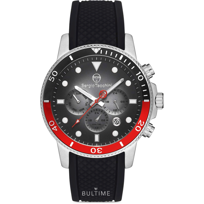 Спортен модел мъжки часовник Sergio Tacchini с мултифункционален дисплей от колекцията Archivio. Корпус от неръждаема стомана. Черна силиконова каишка. Минерално стъкло, устойчиво на надраскване. Задвижва се от кварцов механизъм. Водоустойчивост 5 ATM - допускат се леки пръски и взимане на душ, не се препоръчва обилно мокрене.