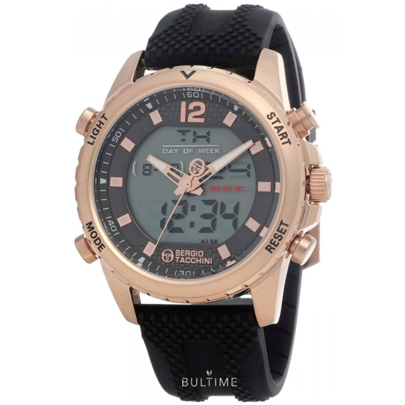 Спортен мъжки часовник Sergio Tacchini с дигитален дисплей от колекцията Heritech. Корпус от неръждаема стомана. Черна силиконова каишка. Стъкло минерал-кристал. Кварцов механизъм. Водоустойчивост 5 ATM - допускат се леки пръски и взимане на душ, не се препоръчва обилно мокрене.