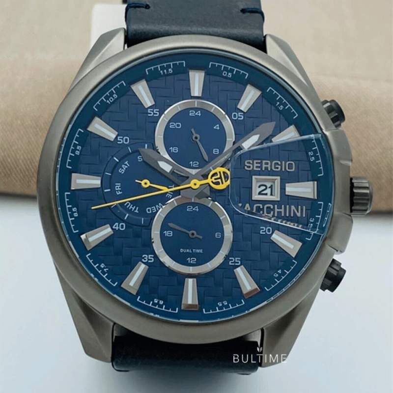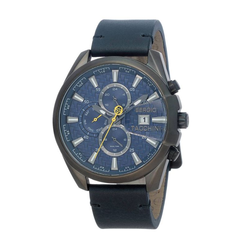 Мъжки спортно-елегантен часовник Sergio Tacchini от колекцията Archivio. Моделът е с тъмносин мултифункционален дисплей с  показатели за дата, ден и двойно време. Каишка от естествена кожа. Корпус от неръждаема стомана. Стъкло минерал-кристал. Кварцов механизъм. Водоустойчивост 5 ATM - допускат се леки пръски и взимане на душ, не се препоръчва обилно мокрене.