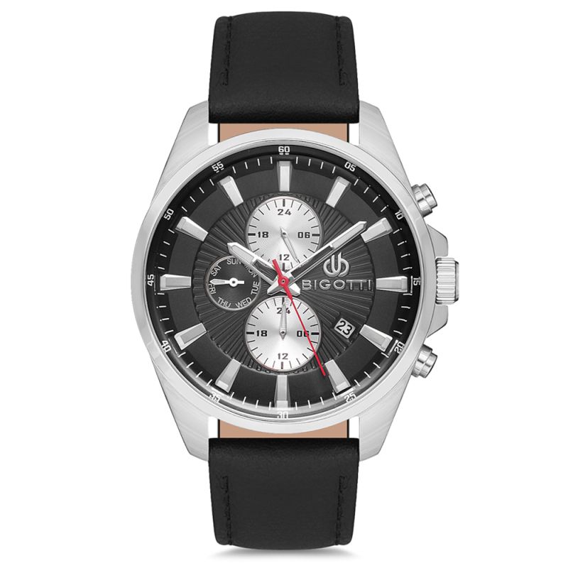 Мъжки часовник Bigotti със спортно-елегантен дизайн. Моделът е с метален копрус. Черна каишка от естествена кожа. Мултифункционален